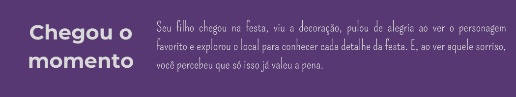 Você prepara com todo cuidado os detalhes da decoração, escolhendo o tema que encanta os olhos do seu pequeno, para que tudo seja perfeito.