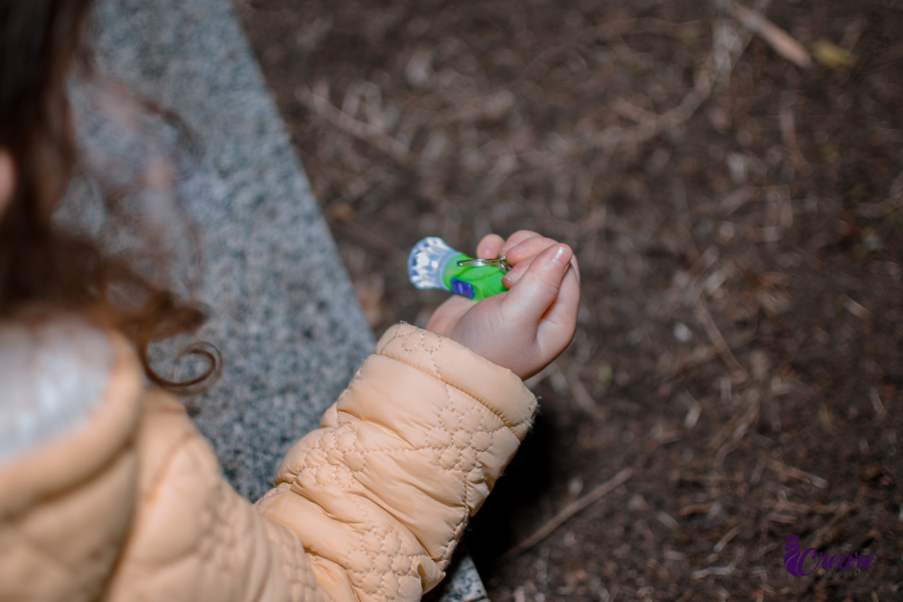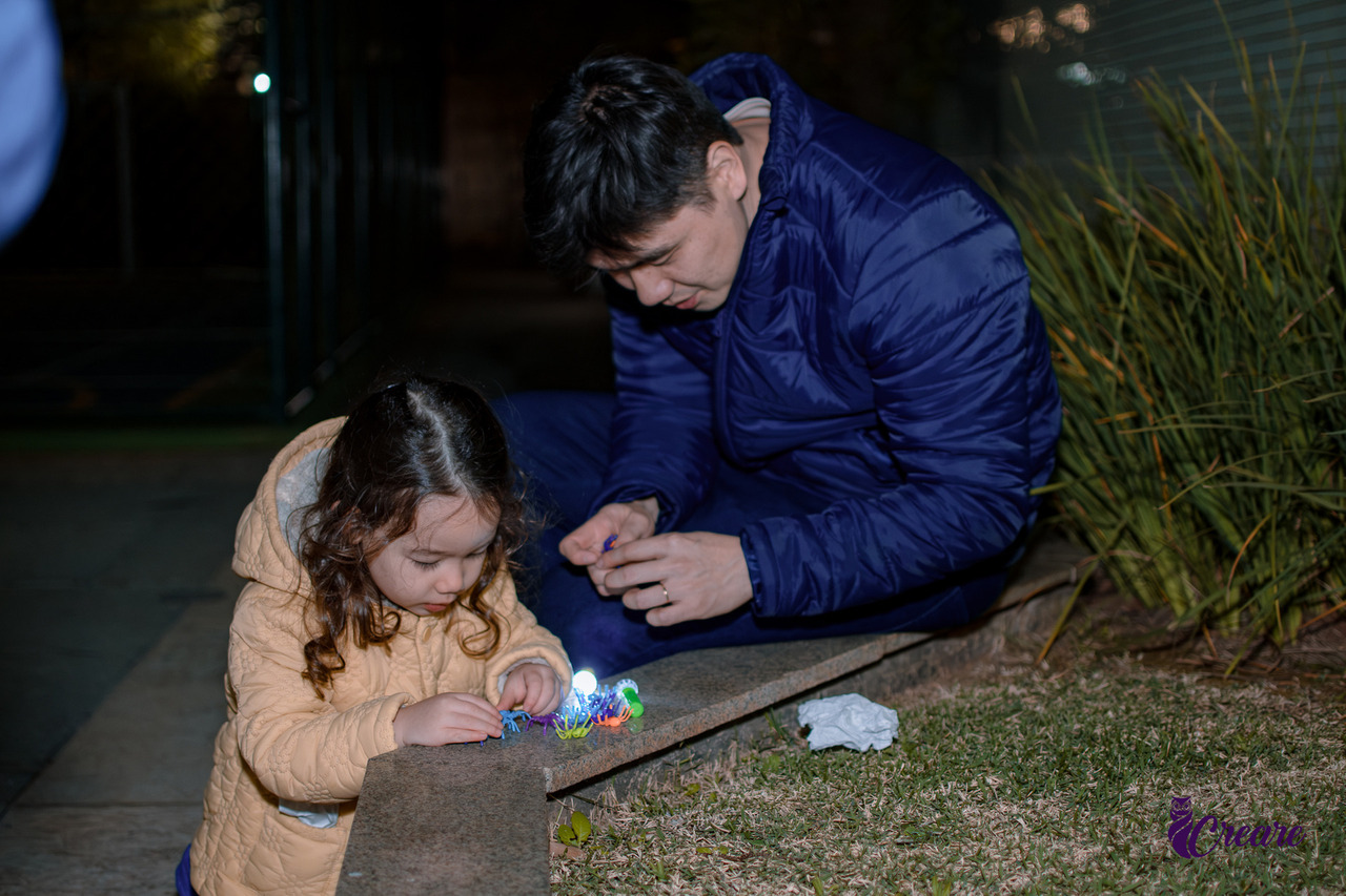 Basicamente, o papai espalhou várias aranhas coloridas pelo hall do condomínio, e as crianças saíram em busca delas. Como estava escuro, eles também colocaram lanterninhas em sacolinhas para que os pequenos pudessem iluminar os cantinhos. Foi muito divertido, e todos adoraram a caçada!
