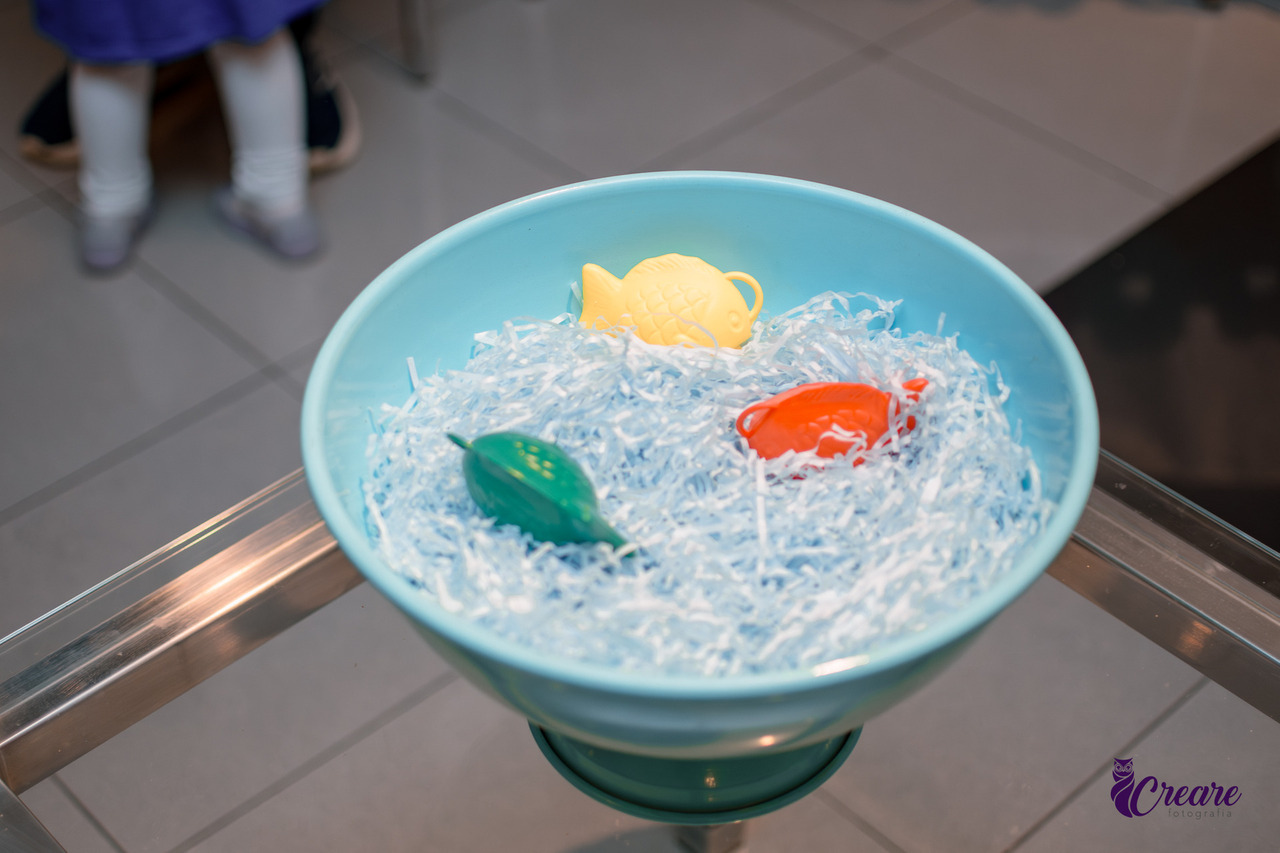 Em vez da tradicional pescaria na areia (quem tem espaço pra isso em apartamento?); a criatividade entrou em ação novamente! Uma pequena bacia com papel picado e alguns peixinhos foram suficientes para garantir a diversão e as risadas das crianças.